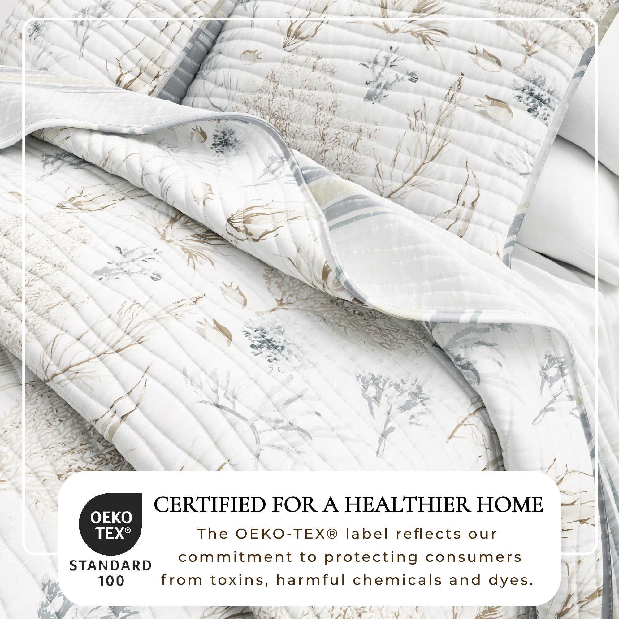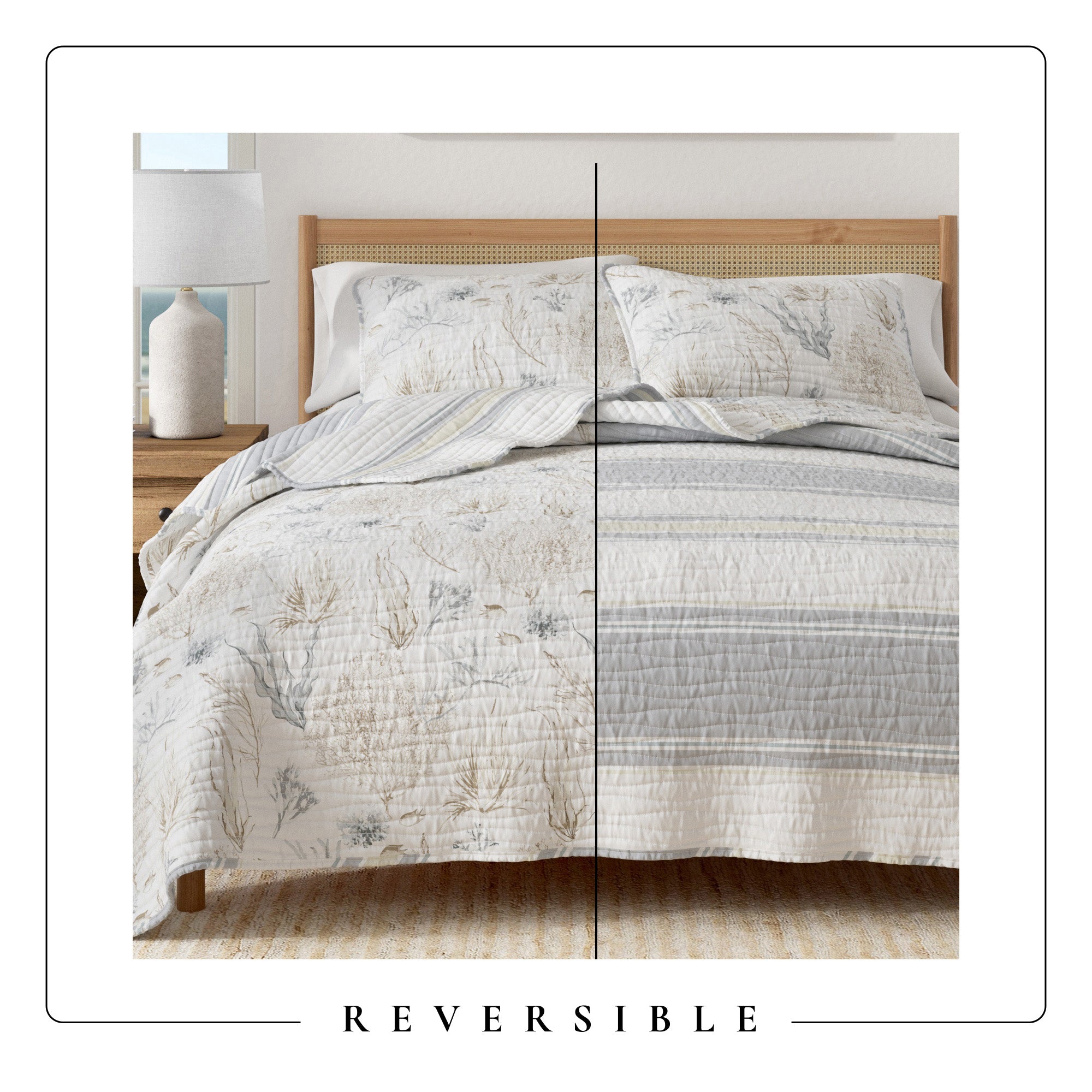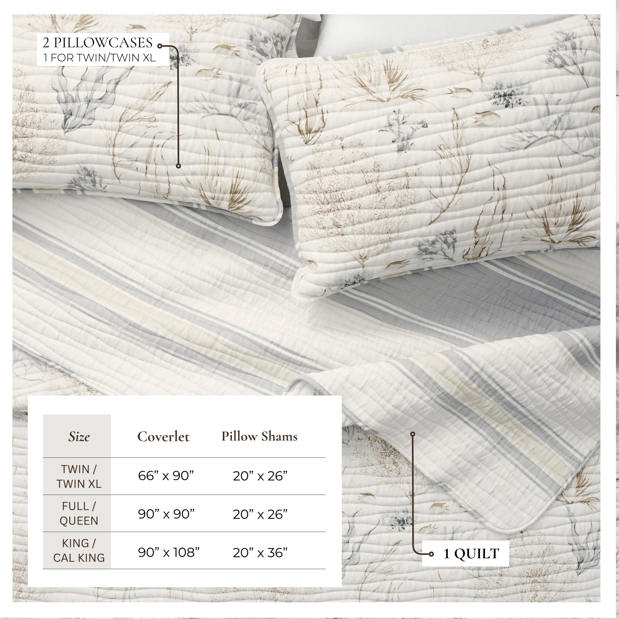 Crafted from quality double-brushed microfiber, this quilt set provides an ultra-soft feel, ensuring a cozy and restful night’s sleep. The lightweight yet durable fabric offers all-season versatility, providing the perfect level of warmth and comfort year-round. Inspired by the tranquil essence of coastal living, this quilt set embodies breezy elegance and effortless style. Whether layered with your favorite bedding for a polished look or displayed on its own as a focal piece, this set blends style and practicality seamlessly, making it an excellent choice for anyone who values both comfort and refined design in their home.