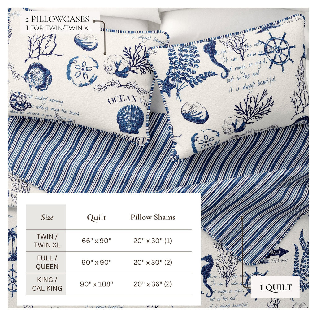 Treat your dreams to a nautical adventure with the seaside-inspired 3-piece quilt set from our Catalina Collection. Boasting eye-popping ocean images on a stunning white-and-blue color scheme, this affordable quilt set can refresh any bedroom.