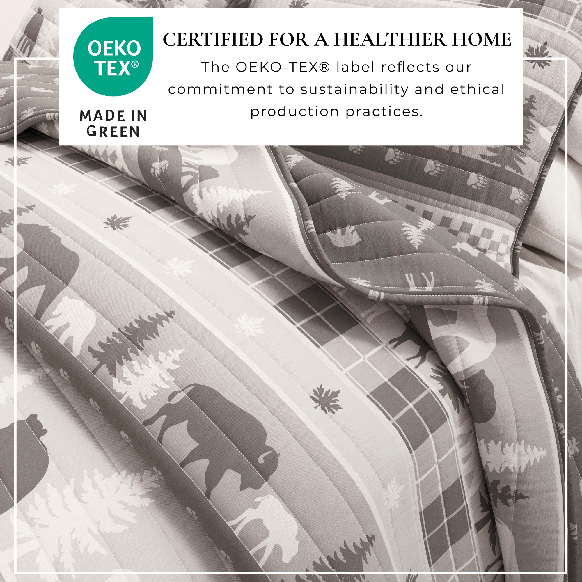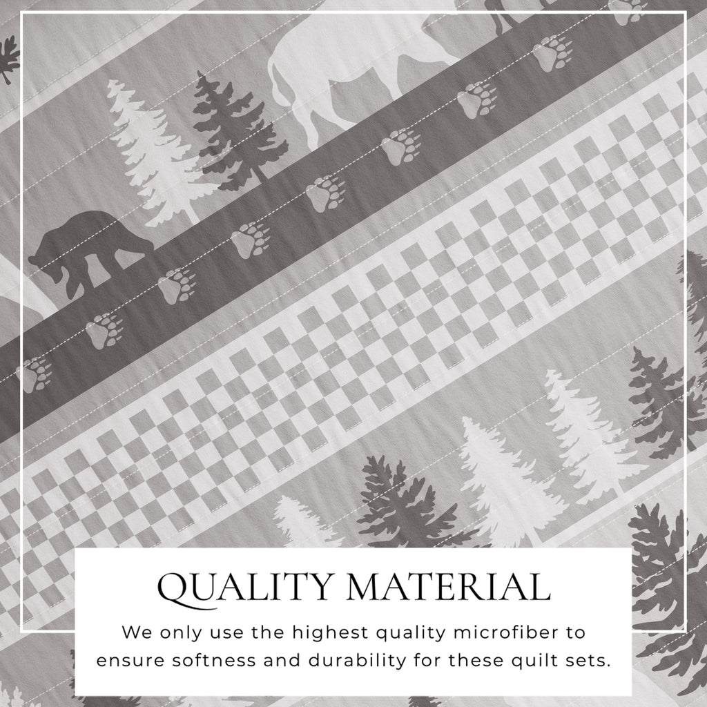This charming lodge-themed quilt set adds a touch of the great outdoors to your bedroom. Featuring detailed prints of trees and woodland animals paired with complementary plaids, this reversible quilt set brings a rustic and cozy feel to any space. Crafted with attention to durability and an ease of machine-washability, this quilt set is perfect for families, guests, kids, and pets. Its lightweight warmth and versatile style ensure comfort throughout every season, making it an ideal addition to your home decor. Experience the cozy embrace of nature right in your bedroom.